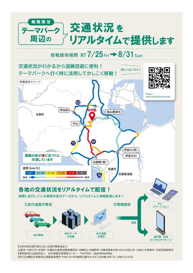 特に開業直後においては、多くの来園者が想定されます。そのため沖縄地方渋滞対策推進協議会北部地域交通円滑化ワーキンググループ(事務局:沖縄総合事務局北部国道事務所)では、株式会社ジャパンエンターテイメントと協働した交通対策に取り組んでおります。